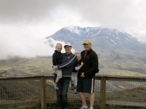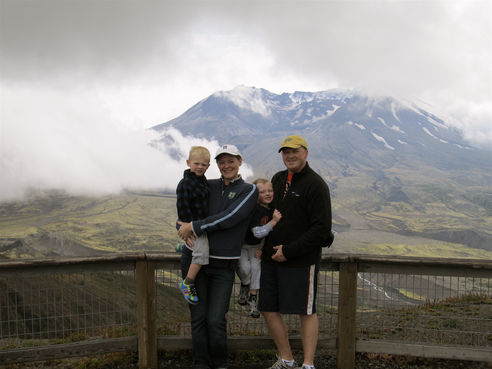 After driving some 50 miles off the interstate, we reached the Johnston Ridge Observatory, a multi-million dollar tourist exhibit that sits on the same ridge where its namesake lost his life. When we got out of our van, the air temperature was 44 degrees and a strong wind was blowing. We hurried the boys to the front of the building, which overlooks the valley, but there were so many clouds out, we couldn’t exactly tell where the volcano was.